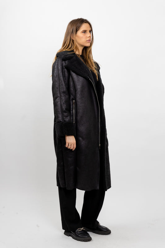 MANTEAU MI-LONG EN SIMILICUIR ET INTÉRIEUR FAUSSE FOURRURE