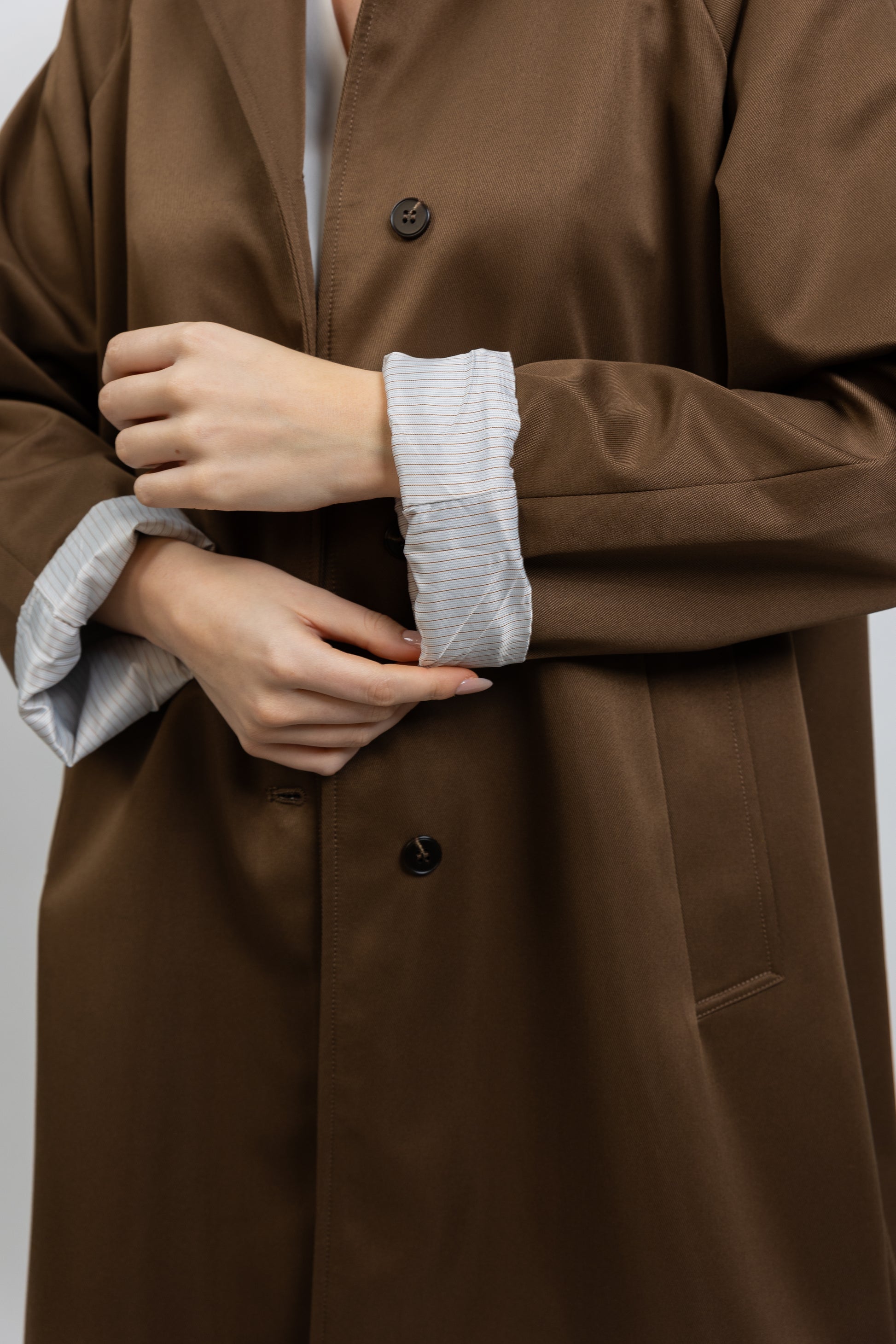 - Front closure with buttons concealed under a placket