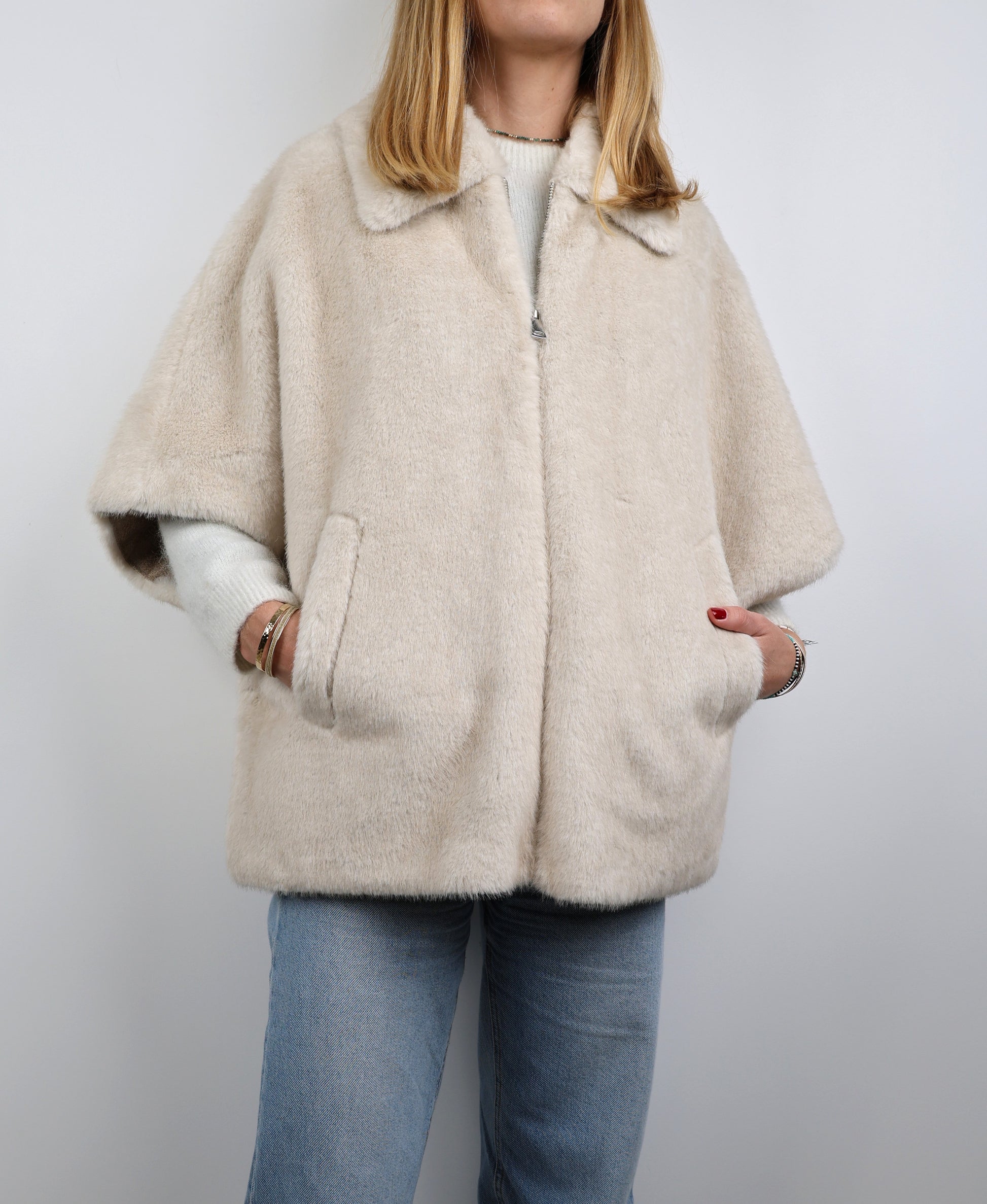 Cette cape en fausse fourrure se distingue par son effet subtil bicolore et sa fermeture éclair qui la rend moderne. L'intérieur est en faux daim, offrant une sensation de douceur et de confort. Les finitions fourrure ajoutent une touche de luxe à cette pièce incontournable. Facile à porter, elle est idéale pour toute occasion.