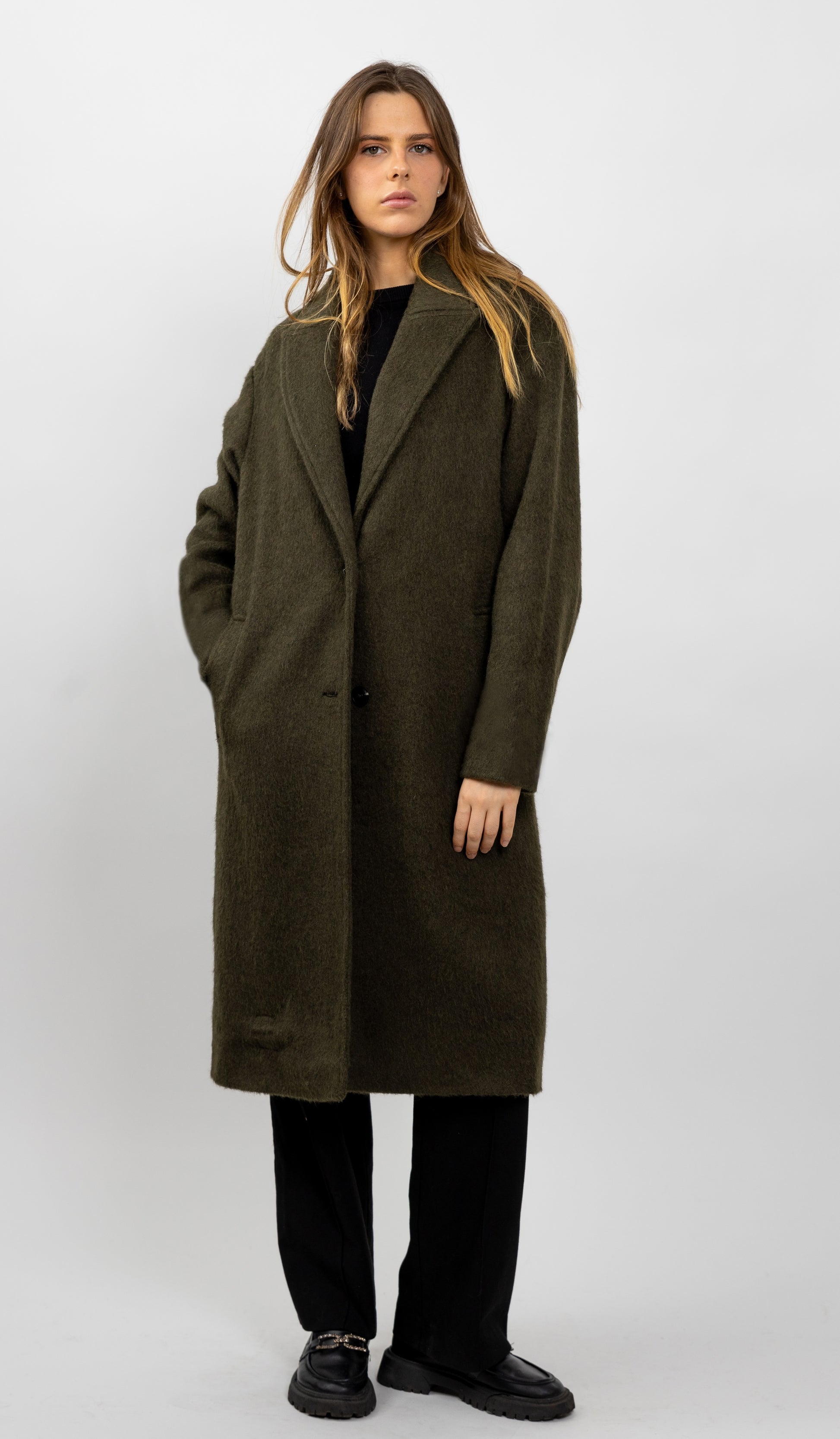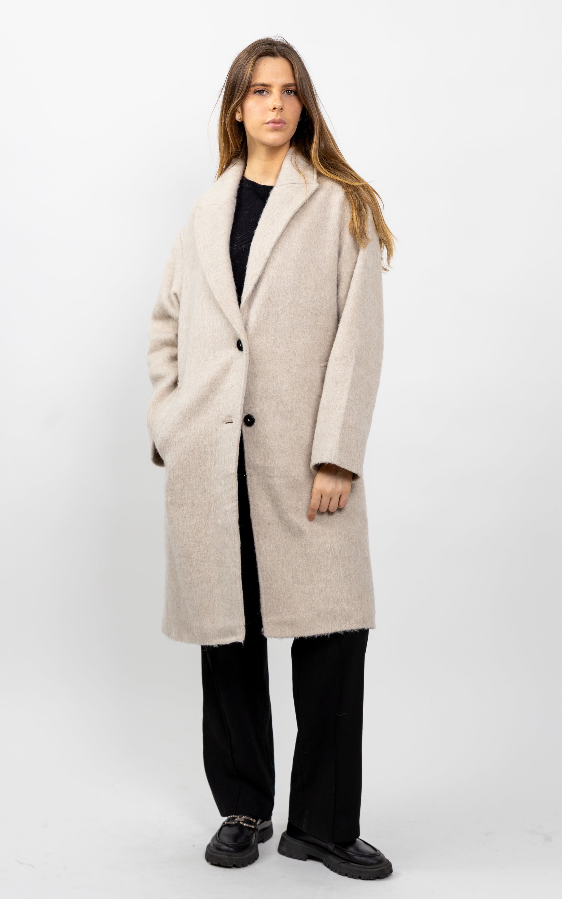 Ce manteau long, chaud et élégant, allie la douceur de l'effet poils longs à la chaleur de 30 % de laine. Il est parfait pour les sorties hivernales, offrant un confort optimal et une allure épurée.