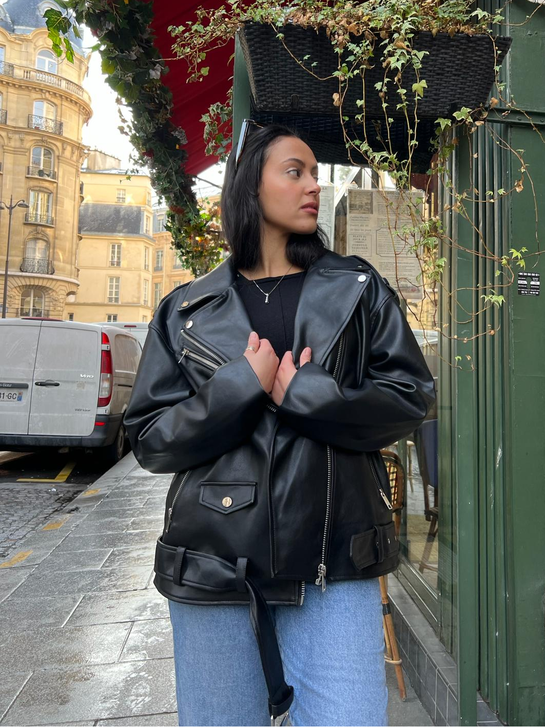 Pour un look casual, associez cette veste en cuir à une robe midi et des bottines.