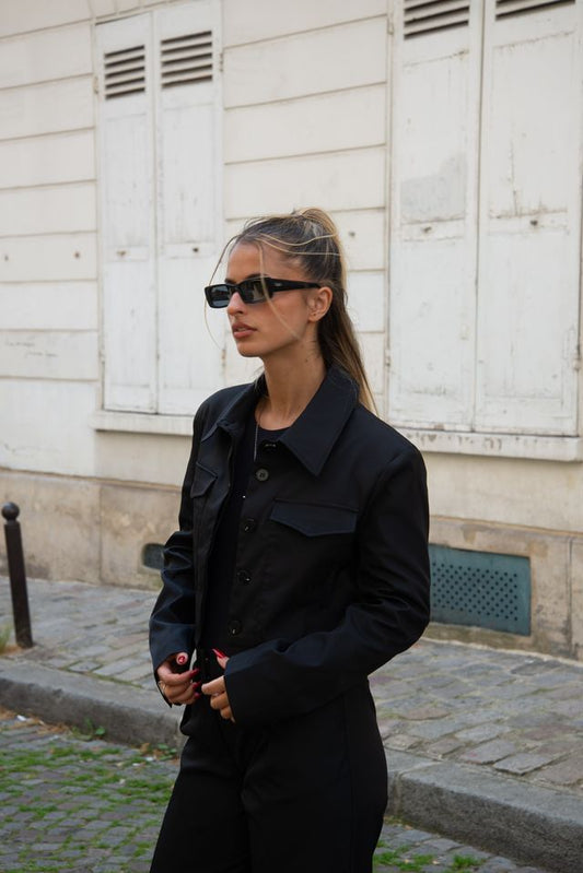 VESTE EN SIMILICUIR À COL CONTRASTÉ