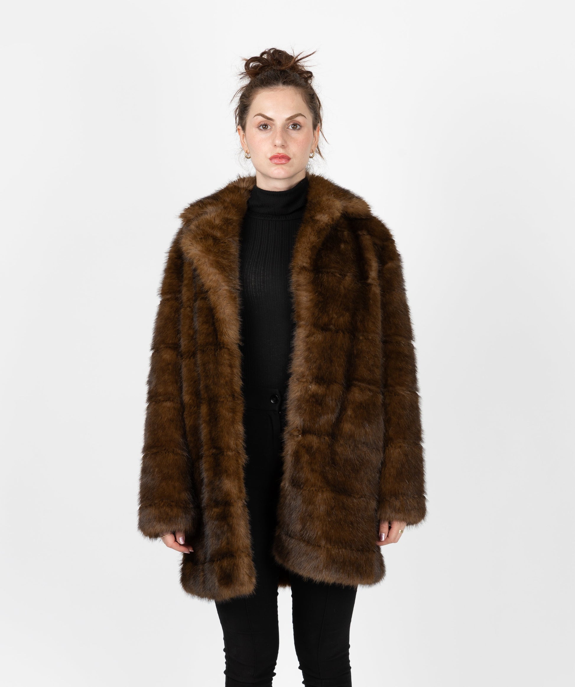 Ce manteau en fausse fourrure se distingue par son original effet de découpes à rayures horizontales. Conçu avec une qualité premium, l'intérieur en faux daim et les finitions fourreur impeccables offrent un confort luxueux et un style inimitable. Cette pièce versatile s'adapte parfaitement pour un look casual de jour ou une touche d'élégance sophistiquée en soirée.